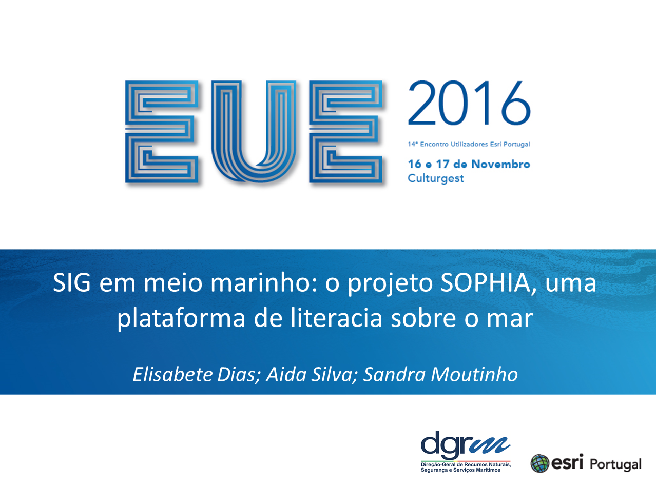 O SOPHIA participou no EUE 2016: 14º Encontro de Utilizadores Esri Portugal que decorreu de 16 e 17 de novembro, na Culturgest, em Lisboa, com uma comunicação oral sobre o contributo do projeto para a aplicação de SIG ao ambiente marinho.